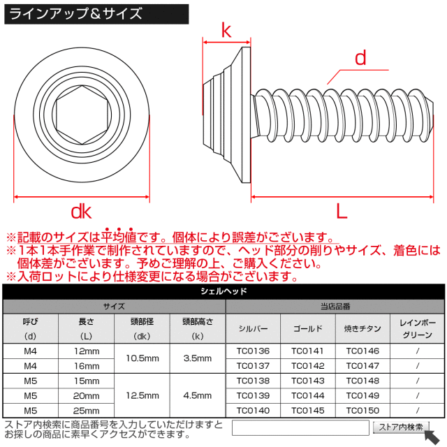 普通のタッピングネジにはない独特なデザインで、ドレスアップ要素を兼ね備えたカスタムネジです。