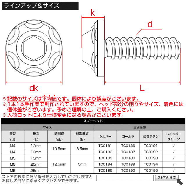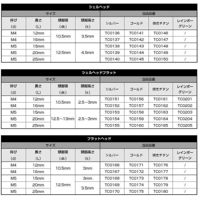 普通のタッピングネジにはない独特なデザインで、ドレスアップ要素を兼ね備えたカスタムネジです。