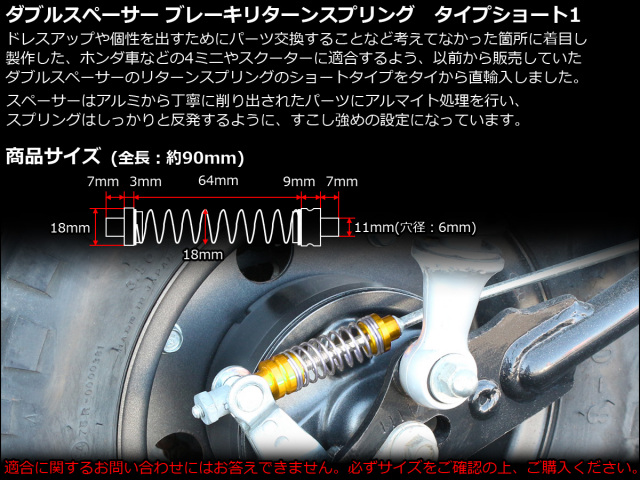 ドレスアップや個性を出すためにパーツ交換することなど考えなかった箇所に着目し、アルミとステンレスで製作した、ホンダ車などの4ミニやスクーターに適合するよう以前から販売していたダブルカラーのリターンスプリングのショートタイプをタイから直輸入しました。