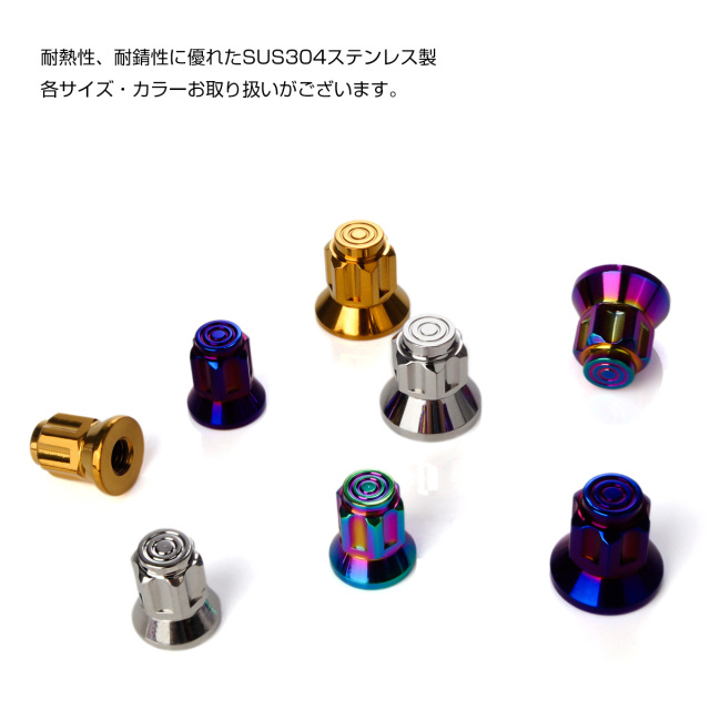 マフラーを取り付けるナットと交換したり、ボルトのネジ山を隠してドレスアップしたい場所など、サイズが合えば様々な箇所にご使用頂けます。