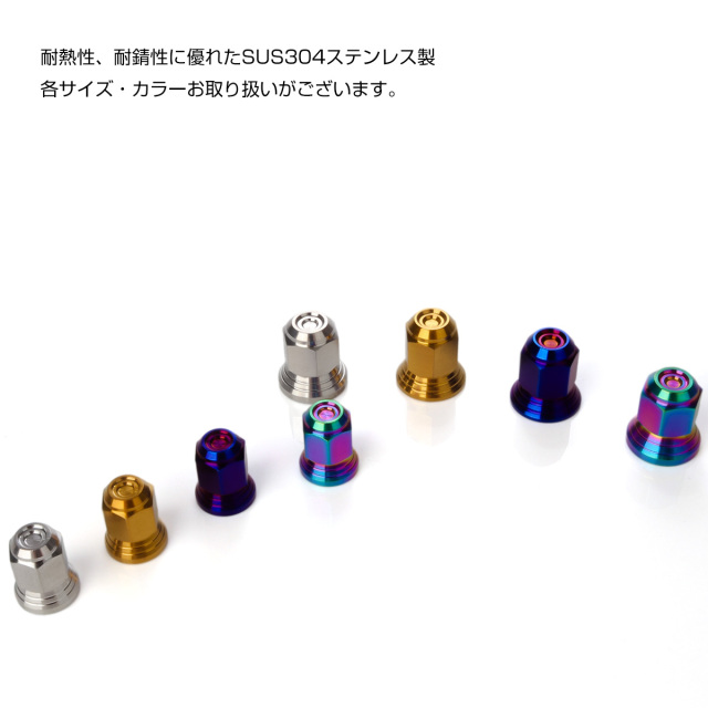 マフラーを取り付けるナットと交換したり、ボルトのネジ山を隠してドレスアップしたい場所など、サイズが合えば様々な箇所にご使用頂けます。