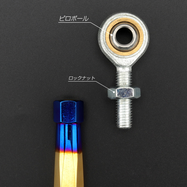強度十分なステンレス製で、ロッドエンドの各ねじ部は正ねじ、逆ねじを採用してますので、取り付けた状態で長さの微調整が可能。