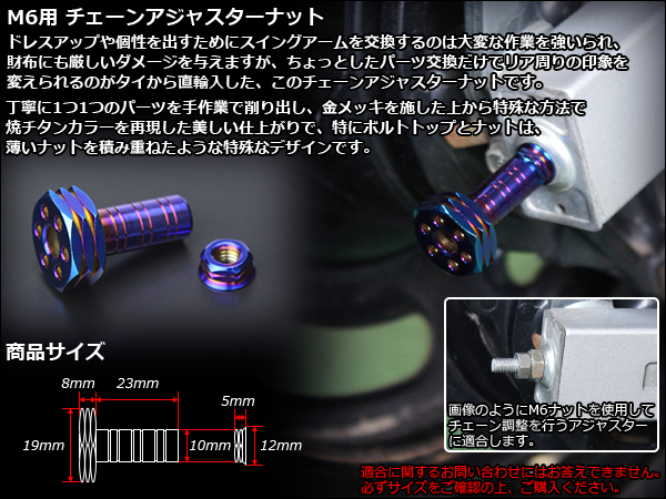 ドレスアップや個性を出すためにスイングアームを交換するのは大変な作業が強いられ、財布にも厳しいダメージを与えますが、ちょっとしたパーツ交換だけでリア周りの印象を変えられるのがタイから直輸入した、このチェーンアジャスターナットです。
