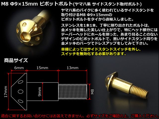 ヤマハ系のバイクに多く使われているサイドスタンドを取り付けるM8 Φ9×15mmのピボットボルトをタイから直輸入しました。