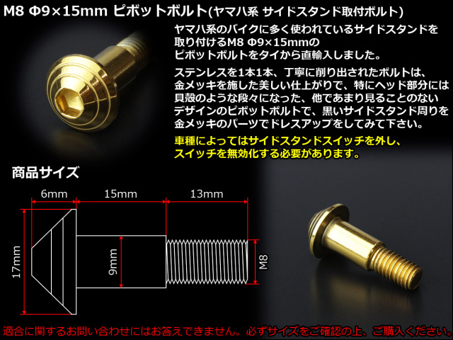 ヤマハ系のバイクに多く使われているサイドスタンドを取り付けるM8 Φ9×15mmのピボットボルトをタイから直輸入しました。