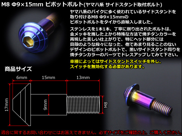 ヤマハ系のバイクに多く使われているサイドスタンドを取り付けるM8 Φ9×15mmのピボットボルトをタイから直輸入しました。