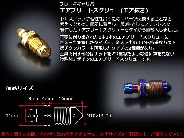 ドレスアップや個性を出すためにパーツ交換することなど考えなかった箇所に着目し、第3弾としてステンレスで製作したエアブリードスクリューをタイから直輸入しました。丁寧に削り出された1本1本のエアブリードスクリューに金メッキを施したタイプと、金メッキの上から特殊な方法で焼チタンカラーを再現したタイプの2種類があり、工具で回す部分はナットを2つ重ねたような他に類を見ない特殊なデザインのエアブリードスクリューです。
