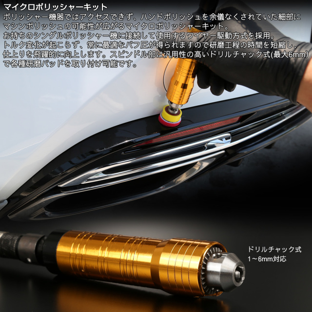 ポリッシャー機器ではアクセスできず、ハンドポリッシュを余儀なくされていた細部にマシンポリッシュの可能性が広がるマイクロポリッシャーキット。