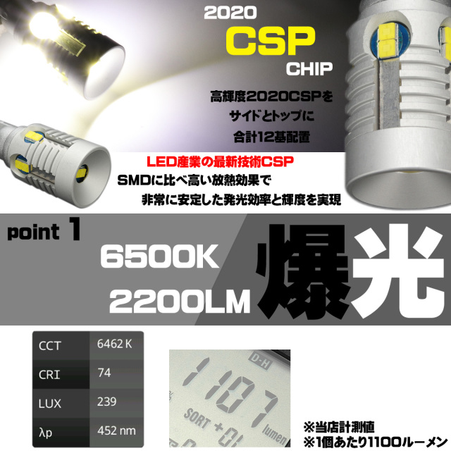 T16 LED ウェッジ バルブ ホワイト 爆光 2200ルーメン 12CSP 接続部 高級仕様 2個セット 12V バックランプ A-166 【メール便可】