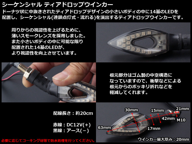 シーケンシャル 連鎖点灯式 流れる LEDウインカー ティアドロップ スモークレンズ SMD14基搭載 アンバー発光 2個セット