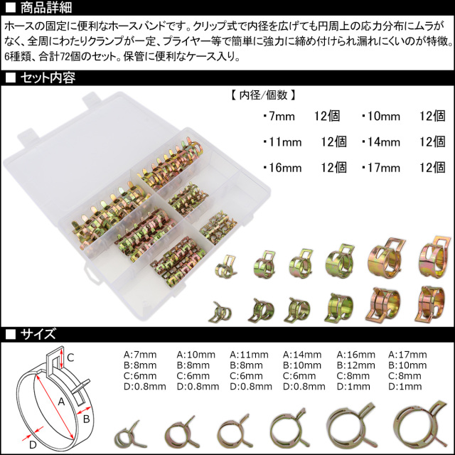 クリップ式 ホースバンド 6種類 72個 セット ケース入り ホースの固定に I-511