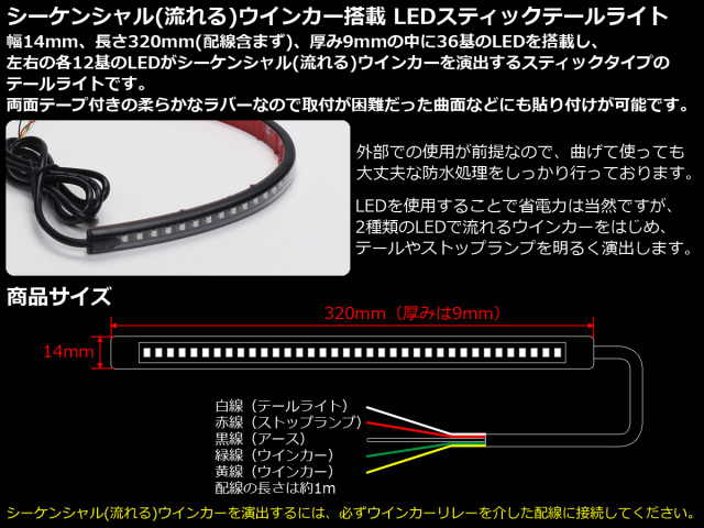 シーケンシャル(流れる) ウインカー搭載 LED スティック テールライト フレキシブルラバー 防水 DC12V専用 P-607