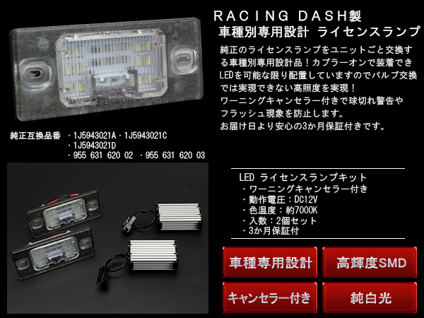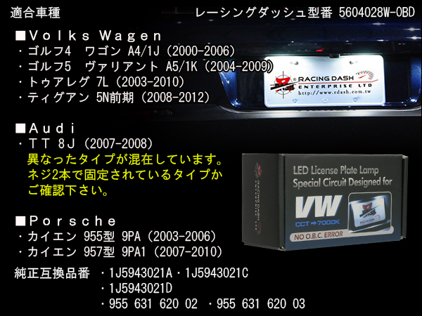 レーシングダッシュ LED ライセンスランプ VW ゴルフ4 ワゴン ゴルフ5 ヴァリアント トゥアレグ 7L ティグアン 5N ポルシェ カイエン 955型 9PA 957型 9PA1 キャンセラー付き 5604028W-OBD RD053