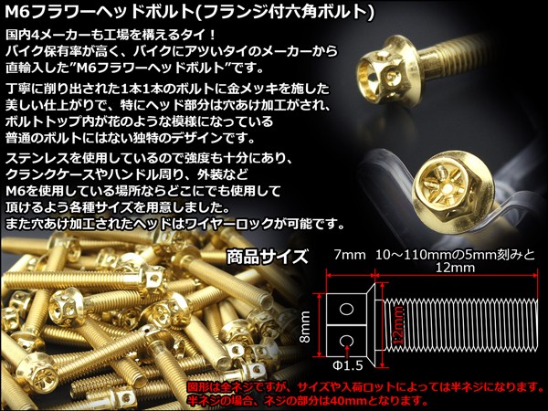 M6×20mm フラワーヘッドボルト ステンレス製フランジ付き六角ボルト クランクケースなどのエンジン周りに ゴールド TB0486 【メール便可】
