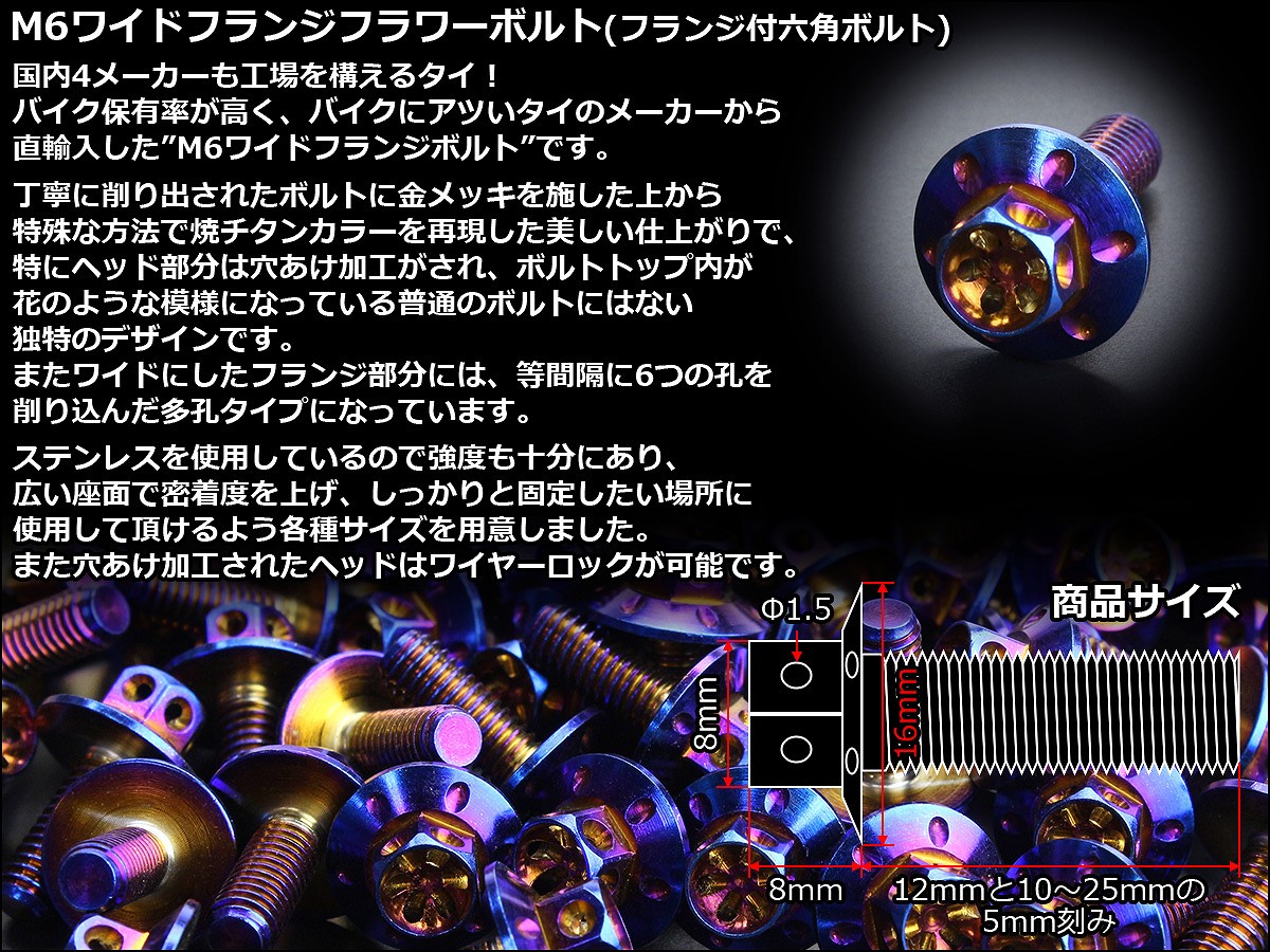 M6×10mm P1.00 ワイドフランジフラワー ボルト ワイヤーロック穴付き 六角ボルト SUS304 ステンレス 焼きチタンカラー TB0965 【メール便可】