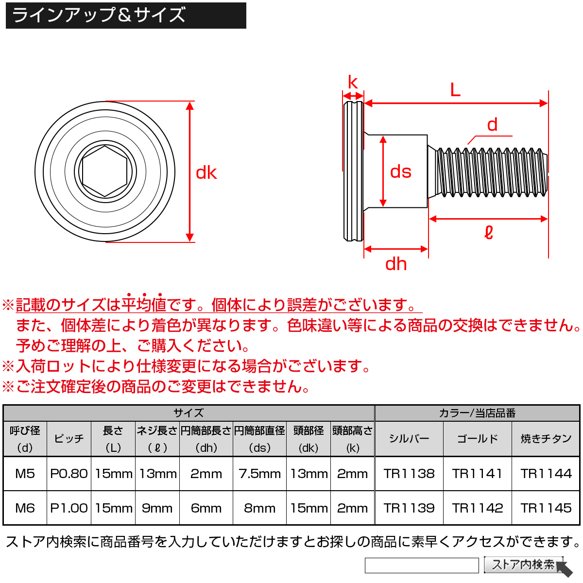 段付きボルト M6×15mm P1.00 円筒部直径8mm ボタンボルト 薄型 六角穴 デザインヘッド フラット マット ゴールド TR1142 【メール便可】